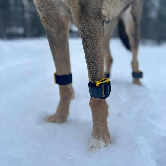L'appareil TendiBoots est un capteur de force embarqué qui se fixe simplement sur un membre du chien via un système de sangle. Il permet de mesurer, en temps réel et avec une grande précision, les charges mécaniques appliquées au sol lors de la locomotion, et ce, membre par membre.